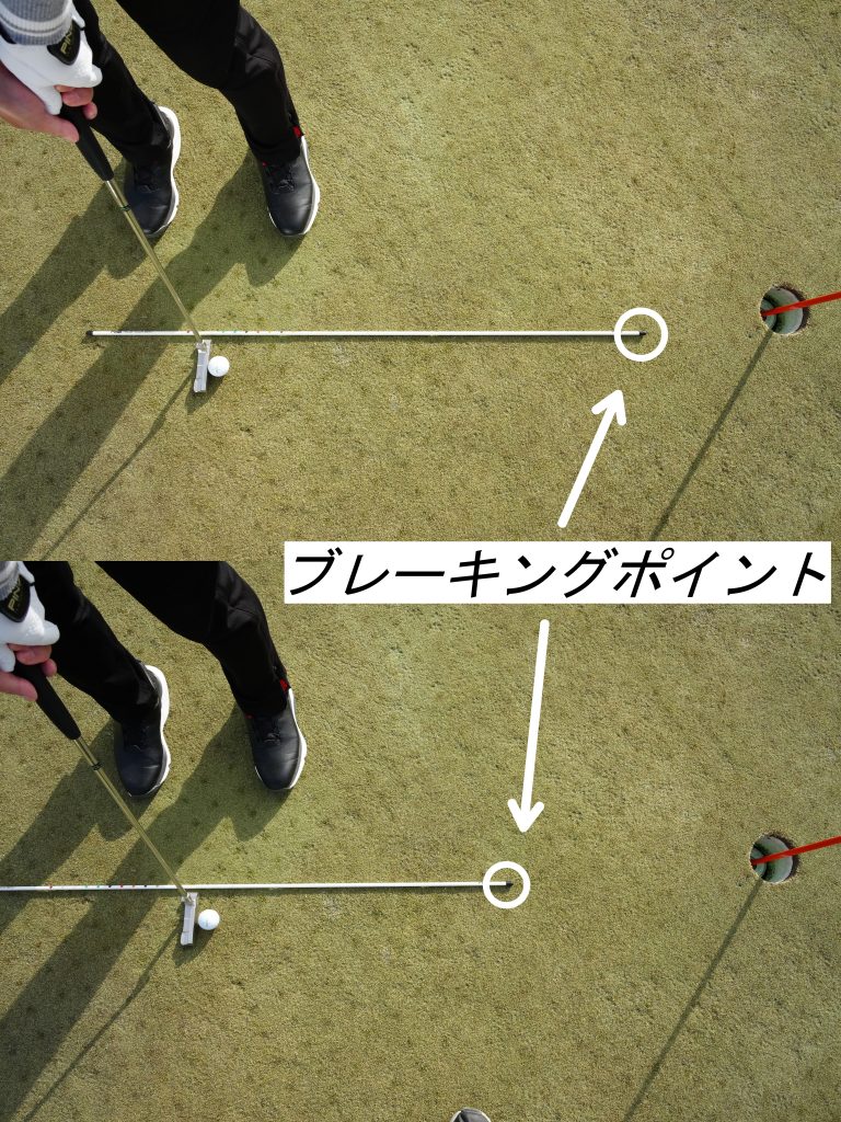 フックラインの場合、狙ったラインに対してヒール側にアライメントスティックを置き、スティックの先端の位置を変えながら打つ練習をする。スティックの置き方を変えるとブレーキングポイントのイメージが変わり、自然とタッチも変わる感覚が養える。スライスラインはトウ側にアライメントスティックを置く