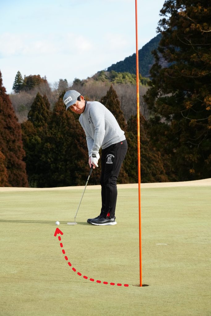 スライスラインや上りのパットは手元が流れてこすったり当たりが薄くなりやすい。左手首の角度を意識し、アドレス時のロフトを保ってストロークするのがポイント