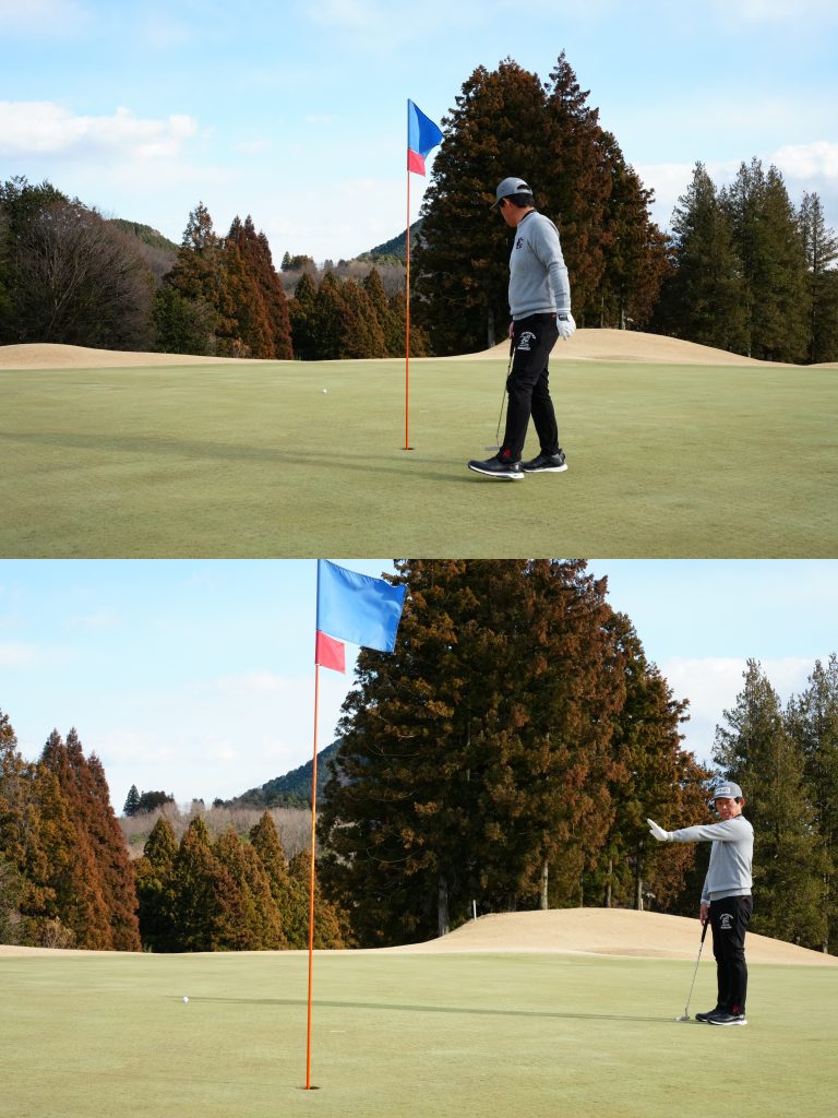 「打つ前には、想像のラインをボールとカップ間で往復させましょう。カップから戻ってくるイメージを重視し、そのラインにフェースが真っすぐ向いているかを確認し、タッチをイメージして素振りをしましょう」