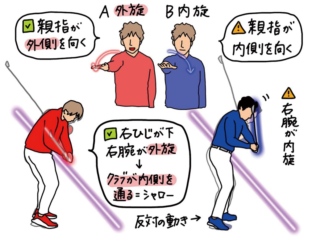 正面に立って腕を伸ばし、親指が内側に動く動作を「内旋」、外側に動く動作を「外旋」と呼びます。プロのようにプレーンに沿ってシャローにクラブが下りてくると、右ひじは下を向き、右腕を外旋させたままスウィングすることができます。