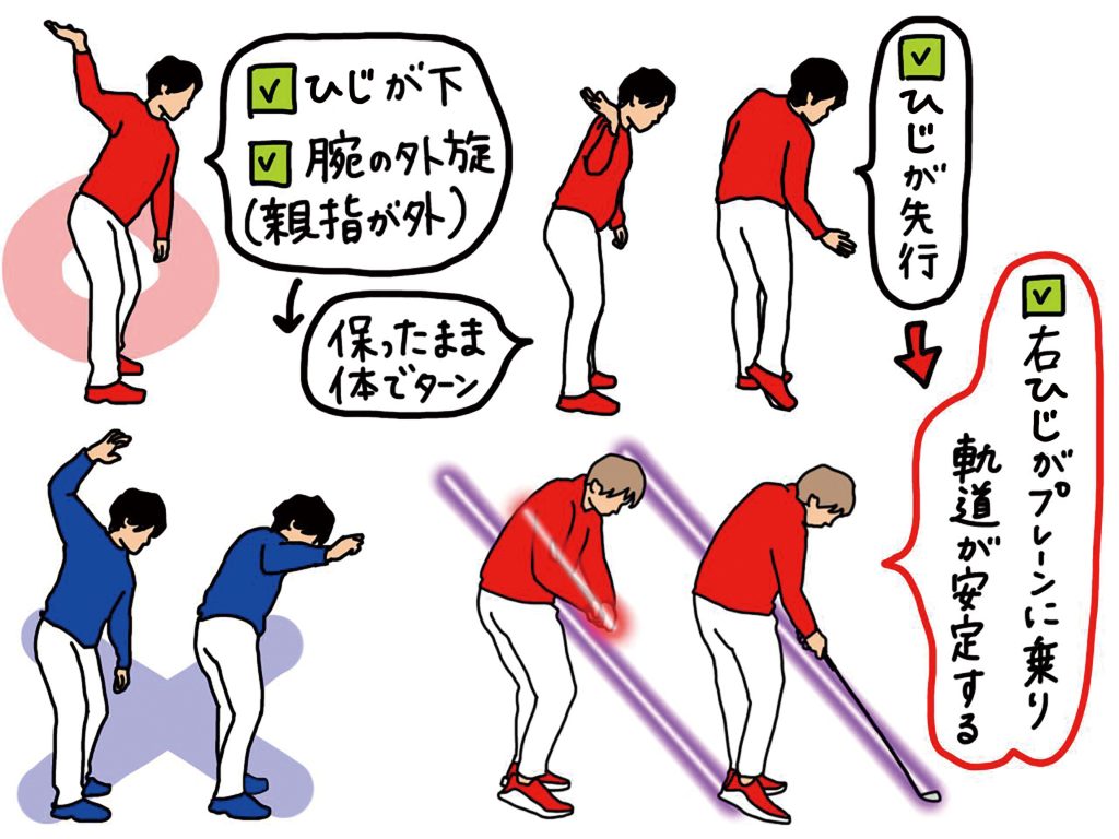 ゴルフスウィングも投球同様、ひじを下に向けて右腕の外旋を起こした状態でトップを迎え、外旋を起こしたまま体のターンでインパクトを迎えることが大切です。この形が達成できると、右わきが締まったままひじが前に出てくる形になります。