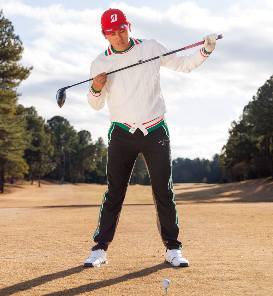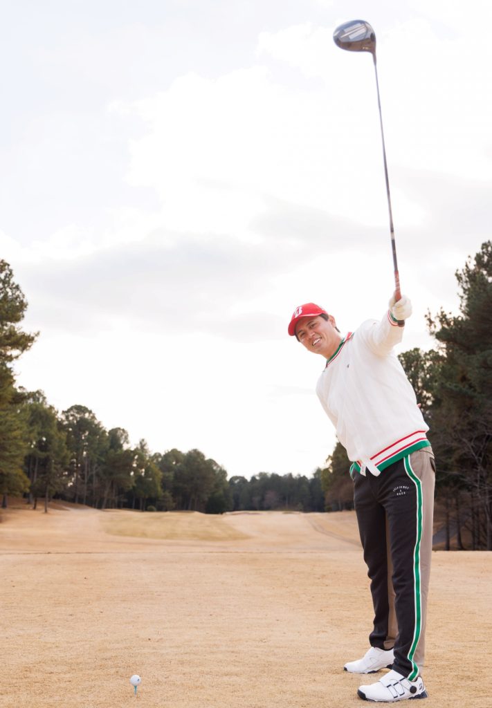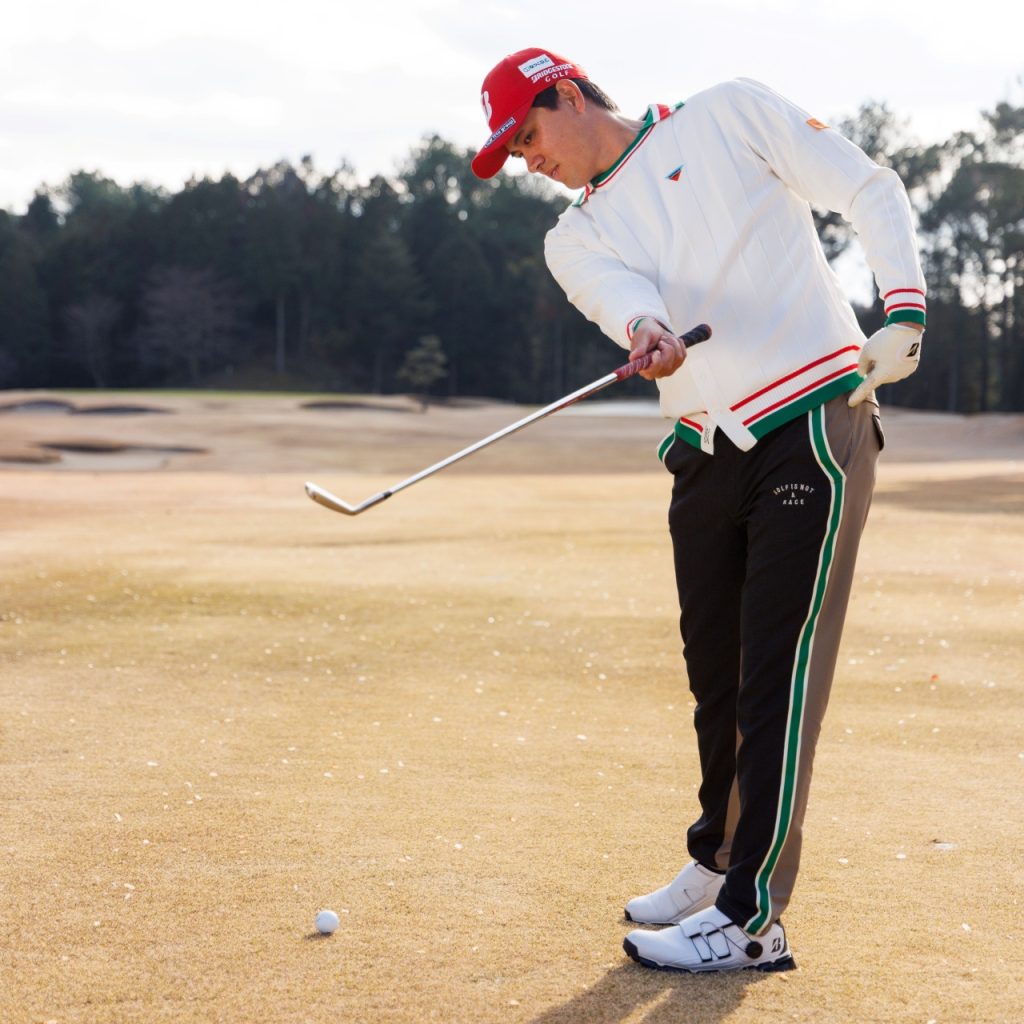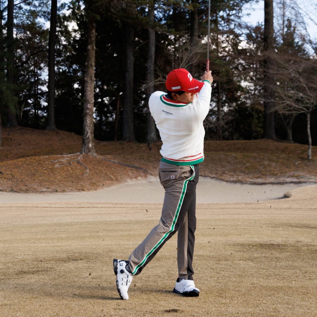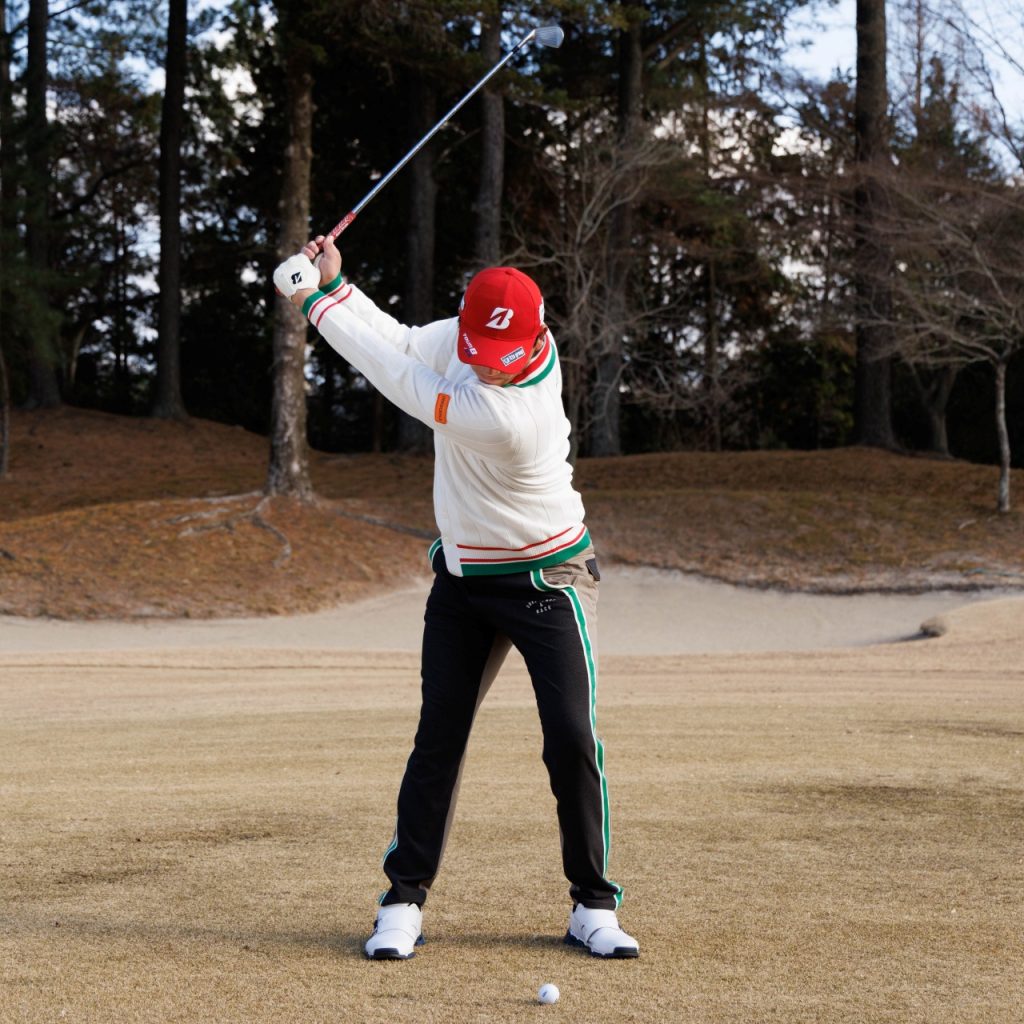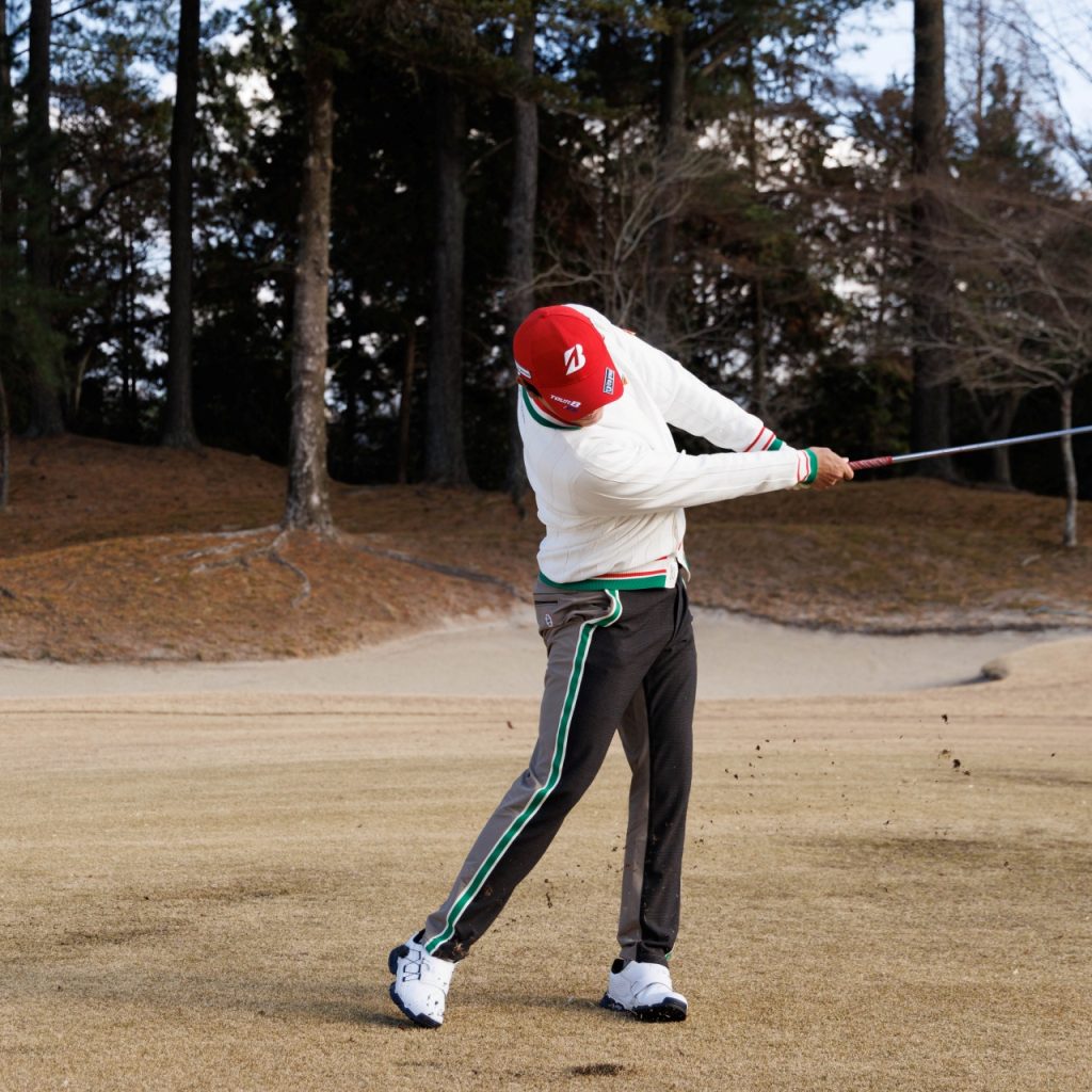 青山 セットアップでは左肩を少し高くする。そして、フォローでヘッドを高い位置に持っていくことだけ意識します。あとは普段と同じように振り切るだけで、自然な軽いアッパー軌道で振れるので、真っすぐ高く打ち出すことができ、フォローの風を利用して飛距離を稼ぐことができますよ。