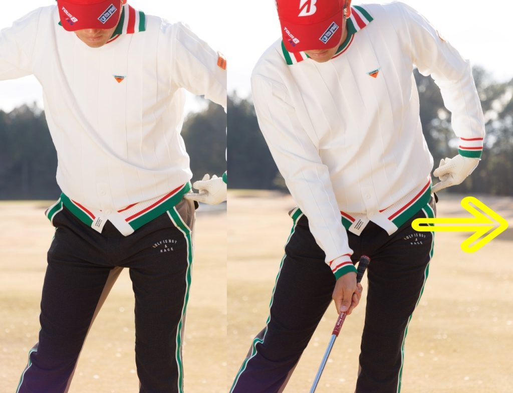 左腰をターゲット方向に突き出すようにスライドさせることで、インパクトでの肩や腰の開きを抑えることができる。さらにフェースにボールが乗る時間が長くなるのでボールを抑えて打つことができる。