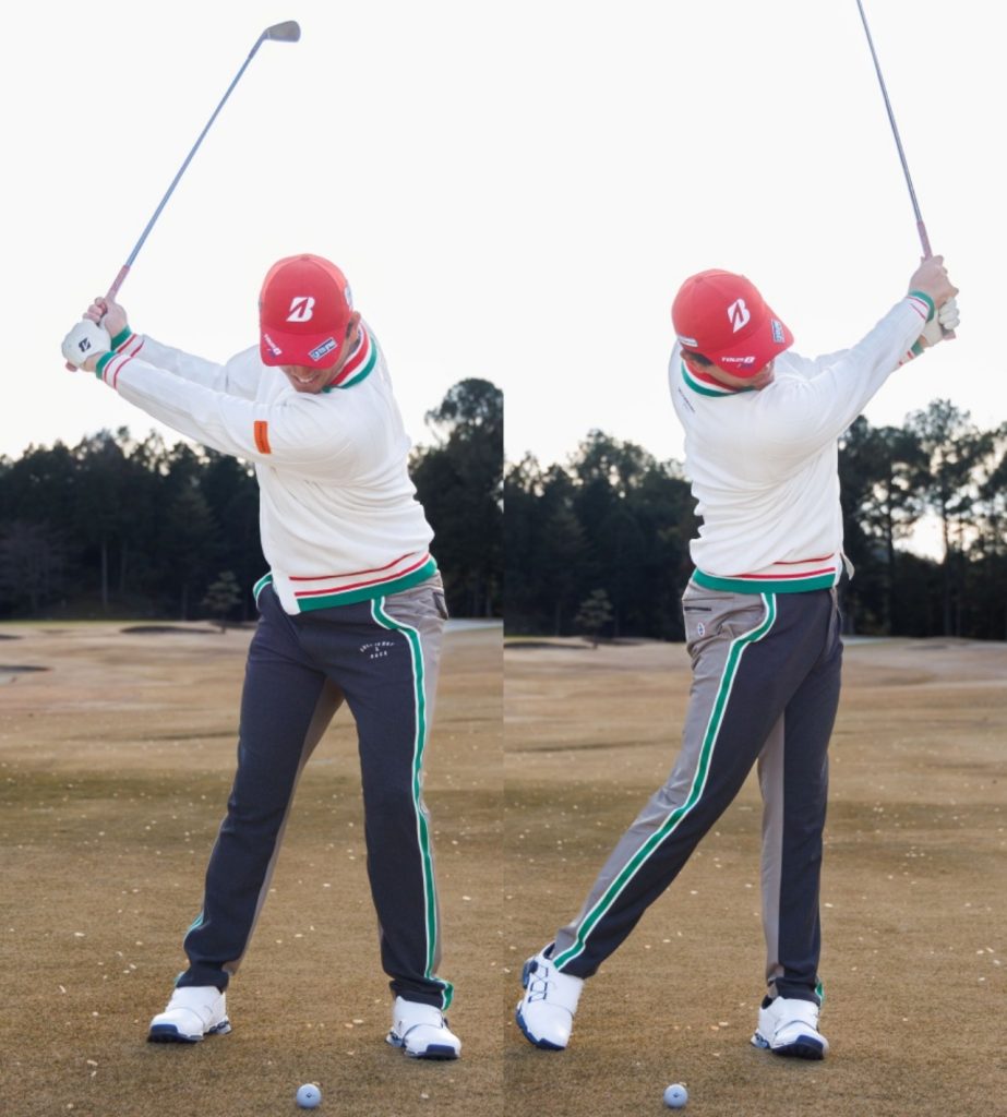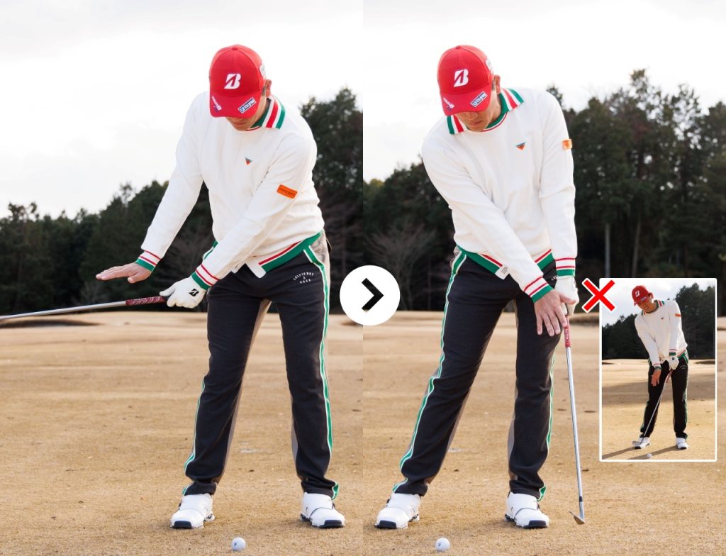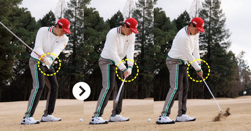右手が常に左手よりも高い位置にあるよう意識しながら、右手のひらを下に向けたまま振ると体が伸び上がらず、低く長いインパクトゾーンが実現する。