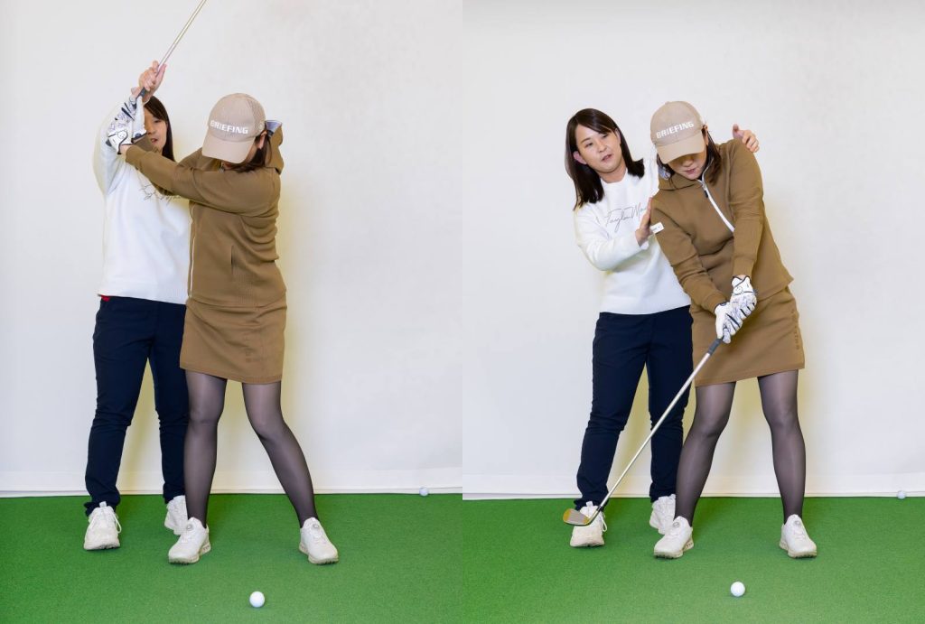 大和田 そこから体を回していくと、これ以上手が上がらなくなるポジションがあると思いますが、そこでトップは終了です。いつもよりコンパクトに感じるとおもいますが、ちゃんとパワーは溜まっています。