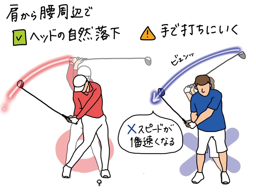 肩から腰辺りまでは、クラブヘッドの重さで自然落下させるようにクラブを下ろすのが正解。しかし、多くのアマチュアは飛ばしたいという気持ちから、手でヘッドを加速しようとする傾向があるという