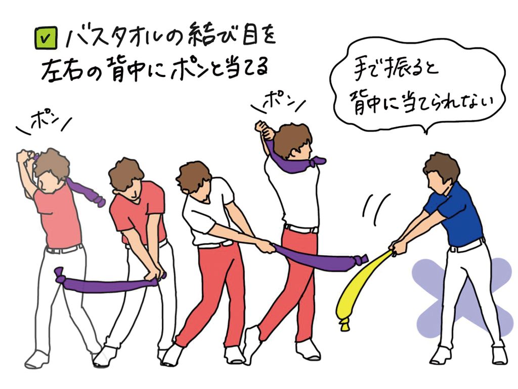 タオルの結び目が背中に向かってスムーズに動かないときは、タオルの重さではなく、腕の力を使っている証拠です! 慣れてきたら、フォロースルーではタオルの結び目が風を切ってビュン!と加速するように振り抜きましょう。