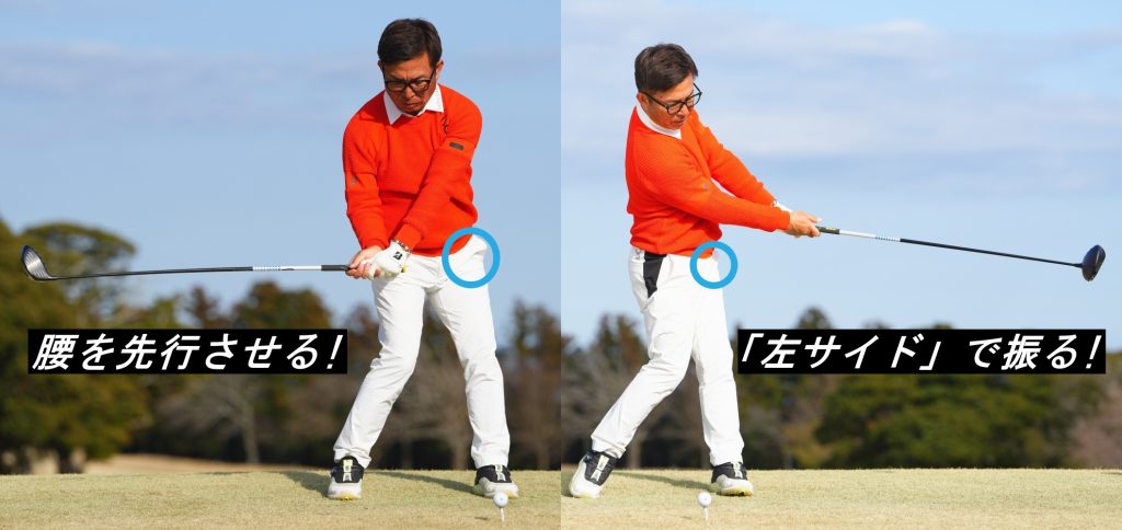 フェースの返りすぎを防ぐには、切り返し以降、体をスピーディに切って腰を先行させていくのがポイント。肩は水平回転のイメージで、体の左サイド、フォロー側でクラブを振るイメージだ。