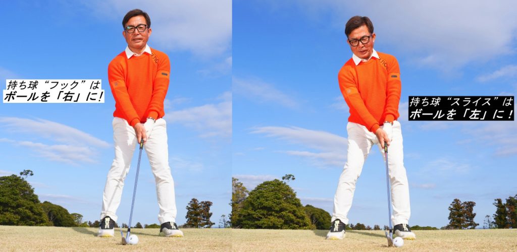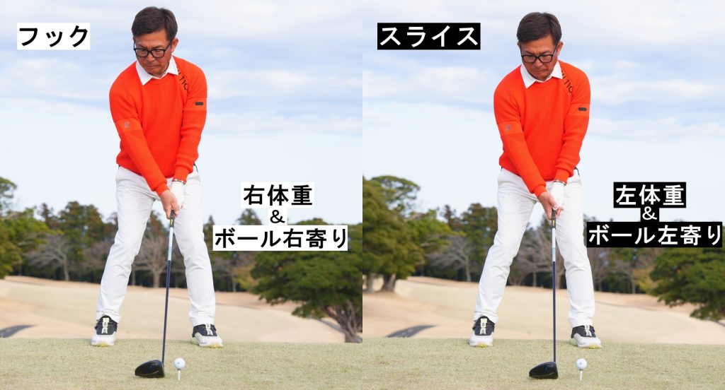フックはやや右体重でボール位置は右寄り、上体を右に傾ける。スライスはやや左体重でボール位置は左寄り、上体は直立気味が自然。構えが持ち球と逆になっていたら要注意。