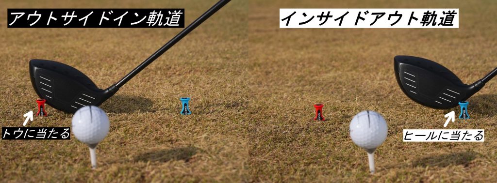 ヘッド後方に置いたヒール側のティーにヘッドが当たる人はインサイドアウト、トウ側のティーに当たる人はアウトサイドイン。ティーの高さは30㎜程度で試してみよう