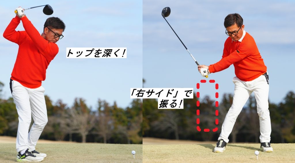 フェースを確実に返すには、トップで右腰を深く回し、間を作りやすくするのがポイント。胸を右に向けたままやや右軸で、右肩を下げるようにダウンスウィング。体の右サイドでクラブを振るイメージを持とう。