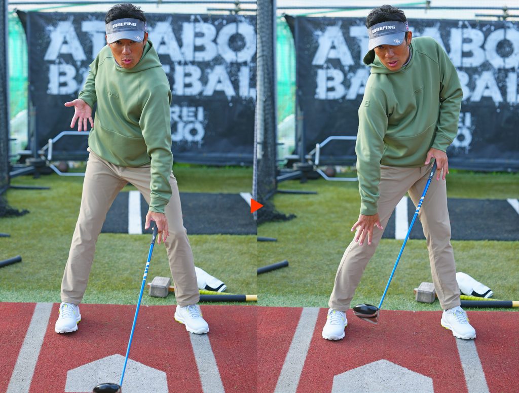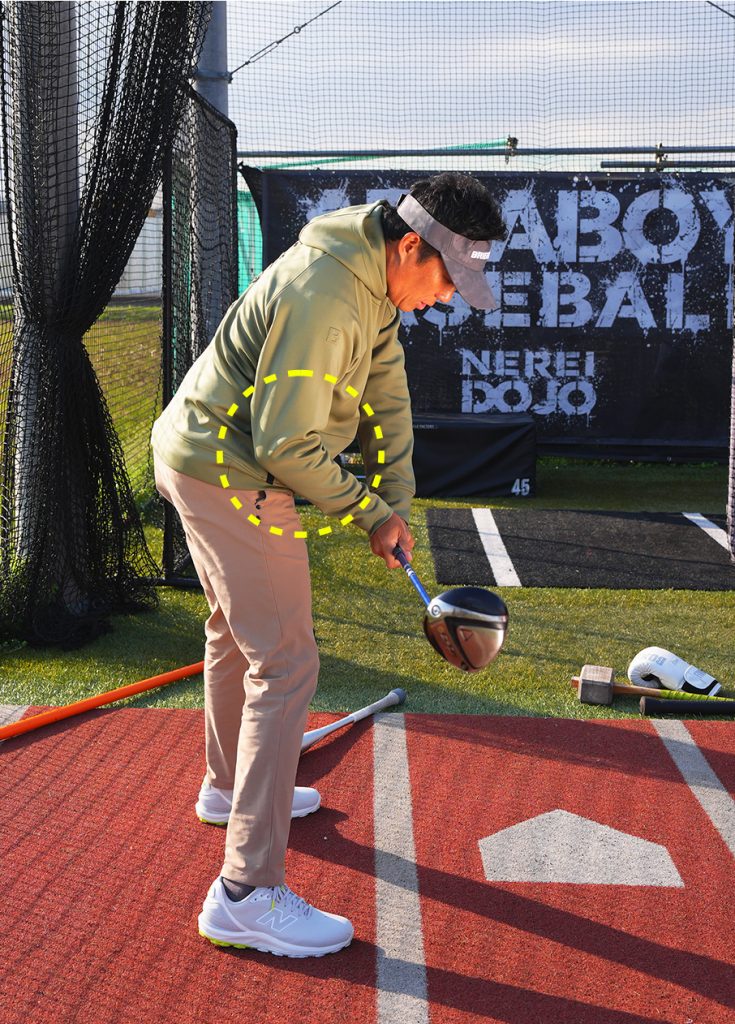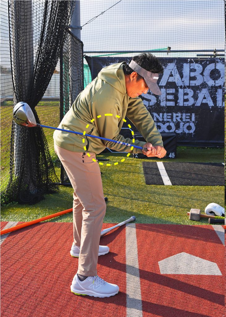 ダウンスウィングで右ひじをおへそに向けるように畳むと、ヘッドはインサイドから下りてくるのでドローになる。野球の外角球を打ちにいくのと同じ形