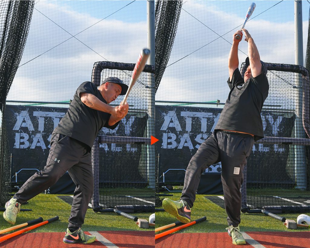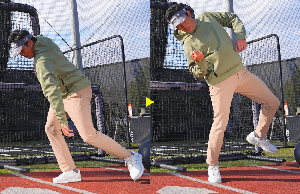 ヒップヒンジを使えれば、軸足側だけで立っていても重たいバットを高速で振り下ろしてダイナミックに振り切ることが可能。ボールに当てることを無視すればこれほどまでに力が出るという好例