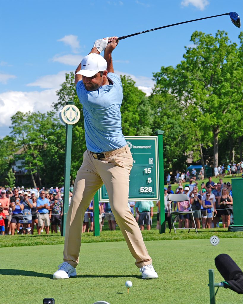 お尻の筋肉に加えて重力を使うことでさらにヘッドを加速させることができるため、手元の位置は高いのが理想。体から離れた位置からダウンスウィングで引き寄せるため求心力も大きくなる