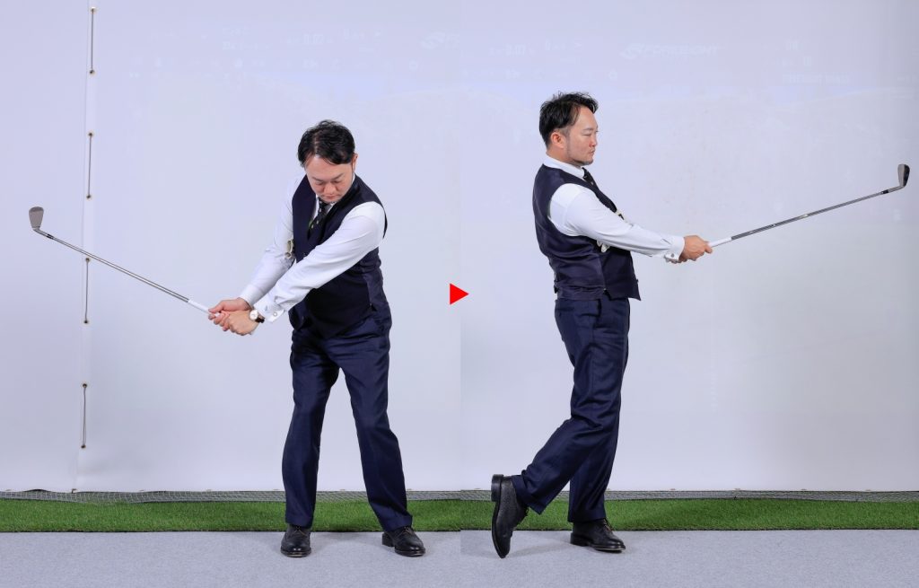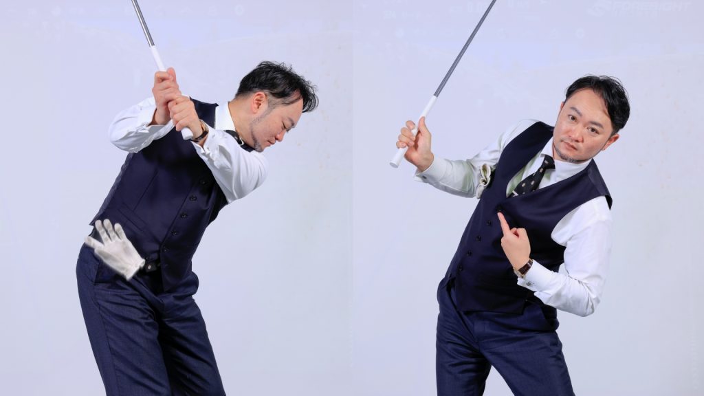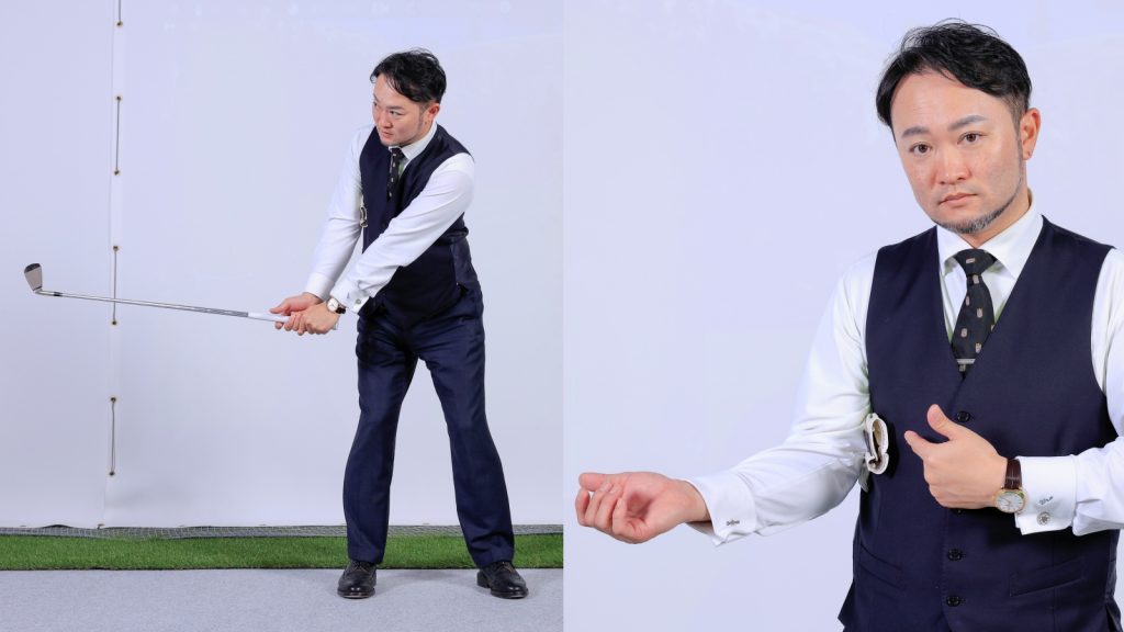 確かに腕と体の一体感を養うのにはある程度効果があって、とくにトップで右ひじが外を向く「フライングエルボー」やフォローで左ひじが引ける「チキンウイング」といったアマチュアに多い不格好な動きを矯正するのには有効な練習だとは思います。