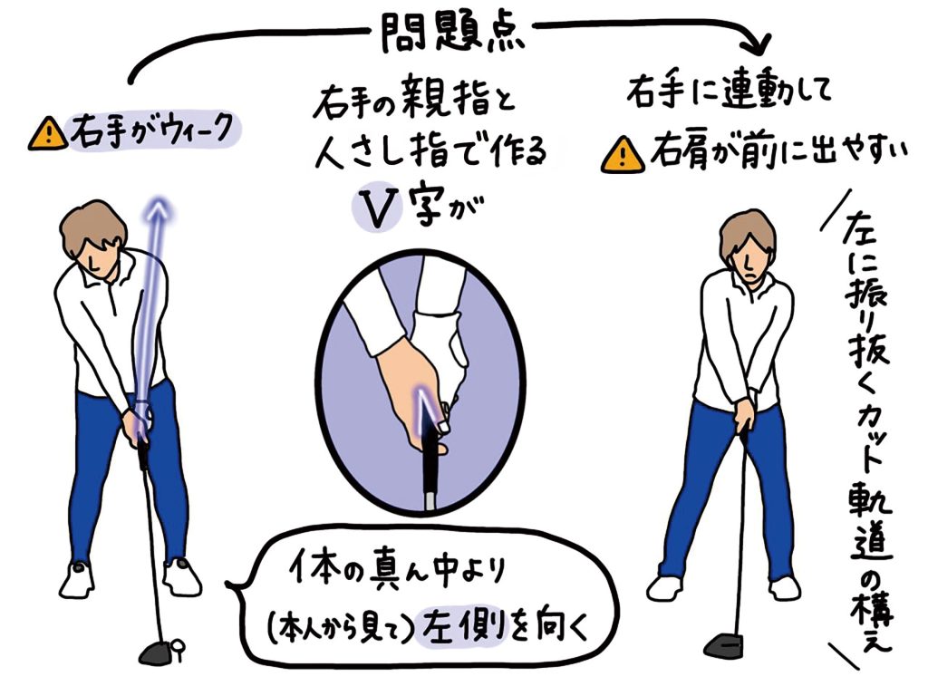 右手ウィークグリップの問題点は、手先の向きに連動して右腕も左側に回りやすくなってしまうため、右肩が前に出て(同時に肩の位置が高くなる)、肩のラインが左方向を向いてしまうことにあります。肩のラインが左を向いてしまうと、クラブを振り抜く方向が左向きのカット軌道になってしまいます。