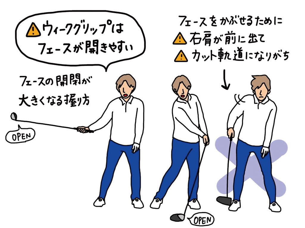 ウィークグリップで握ると、フェースの開閉が大きくなりやすい。ダウンスウィングでフェースが開いてしまうと、フェースを戻すために右肩が前に出やすくなる