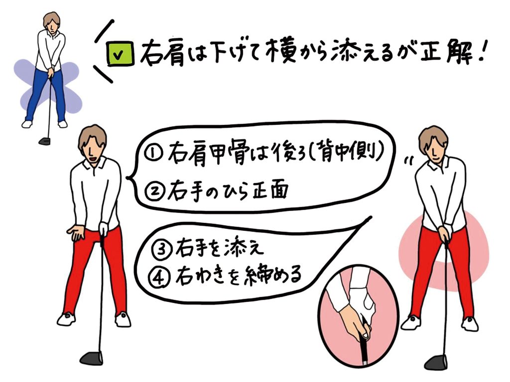 右肩を内側に入れないように背中側に引っ張るイメージで右腕を垂らし、右手のひらを体の正面側に向けよう。そのまま右手を横から添えるようにグリップを作り、最後に右わきを締めれば、右肩が前に出にくいグリップが完成する