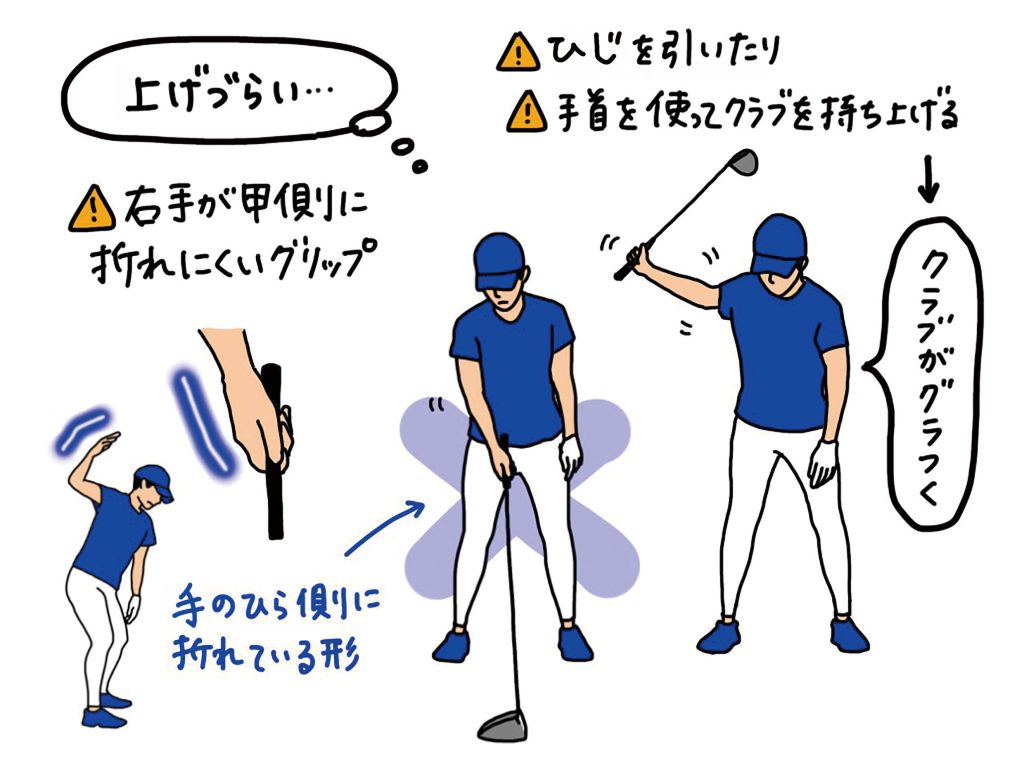 下のイラストのように、アドレスで右手が手のひら側に折れる状態で構えてしまうと、バックスウィングでクラブを上げにくくなってしまいます。