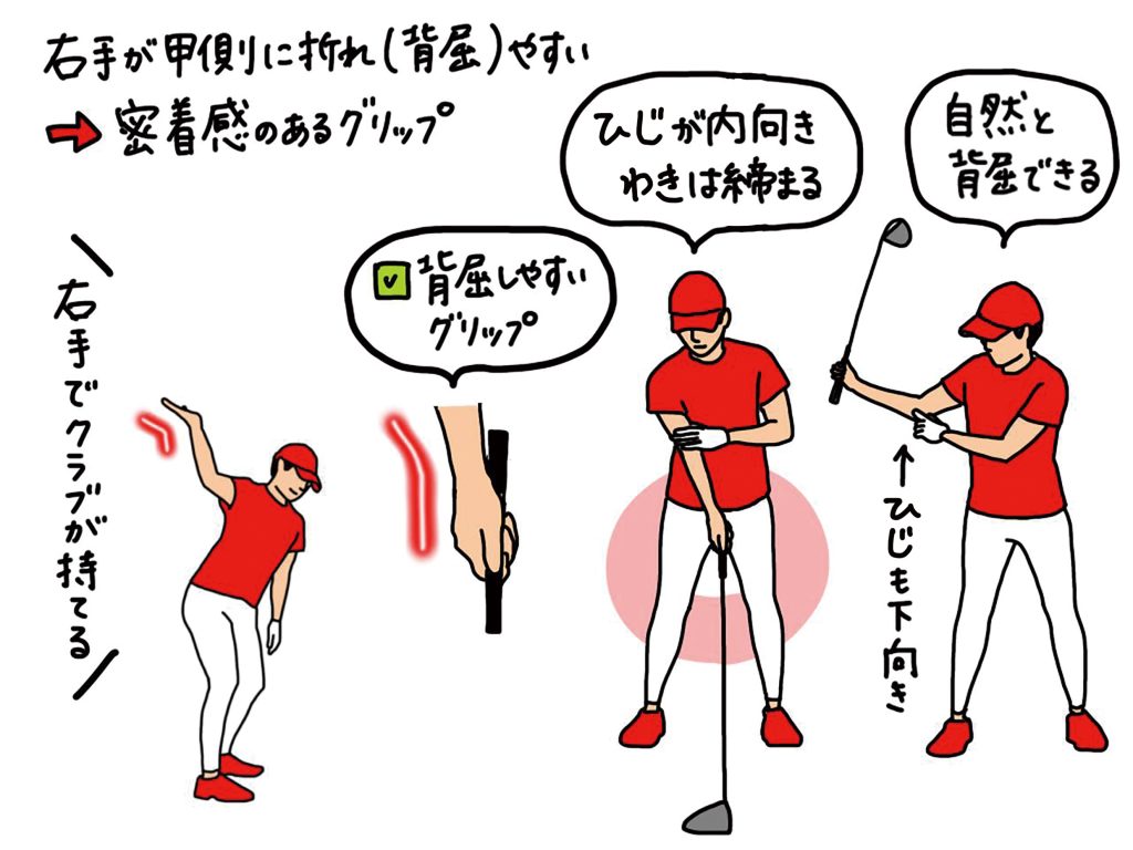 今回は、軌道やフェース面をグラつかないように管理する役割がある右手のグリップについて、ゴルフイラストレッスンで解説していきましょう!