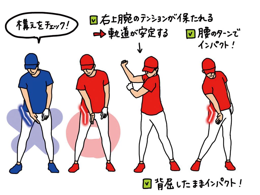 このことから、スムーズでスクエアなバックスウィングを行うには、右わきが締まって、右ひじが下を向いて右の手首が背屈しやすい構えであることが大切なのです。