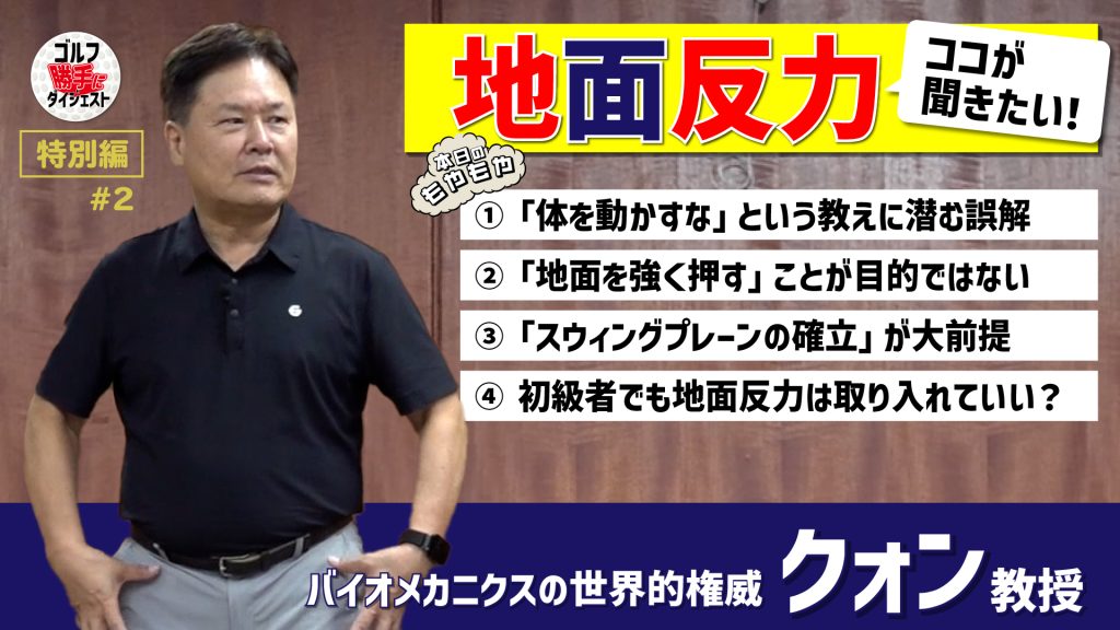 ゴルファーが抱えるさまざまな“もやもや”を、専門家たちが勝手に翻訳・解説するトーク動画「ゴルフ“勝手に”ダイジェスト」(=勝手にGD)。今回は「反力打法」でお馴染みのクォン教授をゲストに迎えた特別編の2回目。引き続き地面反力の効果的な活用法について聞いていこう。