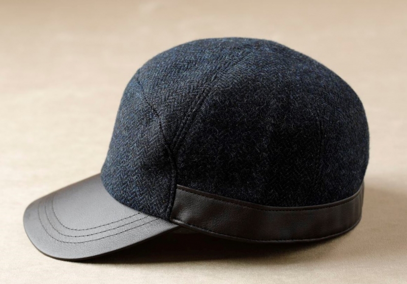 レザー使い ヘリンボーン柄ウールキャップ
