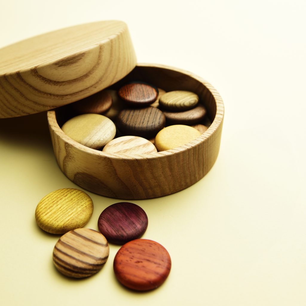 ●素材/天然木(20種類の木のピース) ●サイズ/直径約25~30㎜×厚さ約5~7㎜木箱入り