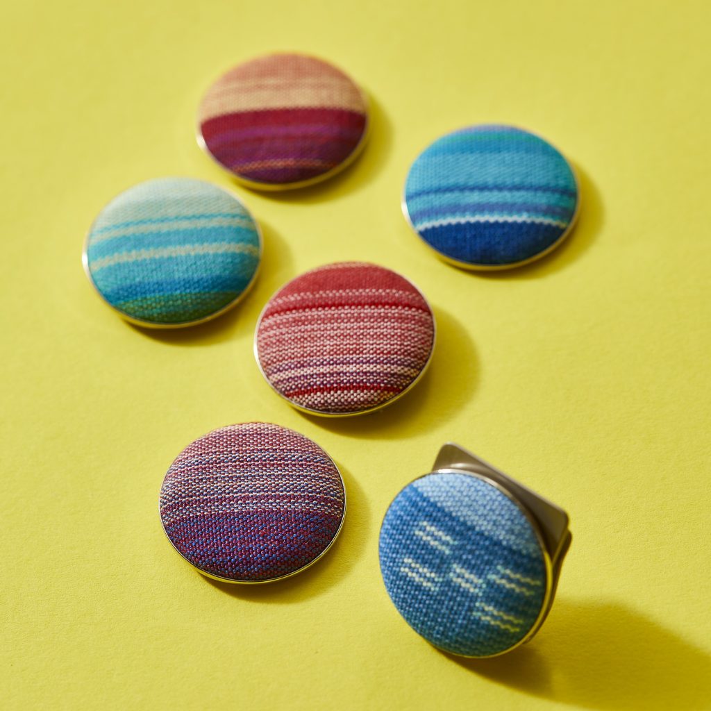 ●素材/木綿、真ちゅう、鉄(クリップ) ●サイズ/直径約30㎜ ●カラー/TAMI(青系)、TABI(赤紫系)