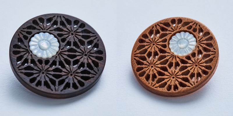 ●素材/黒檀、南洋桜、天然白蝶貝 ●種類/黒檀(濃茶色)、南洋桜(茶色) ●サイズ/直径約40㎜、化粧箱入り