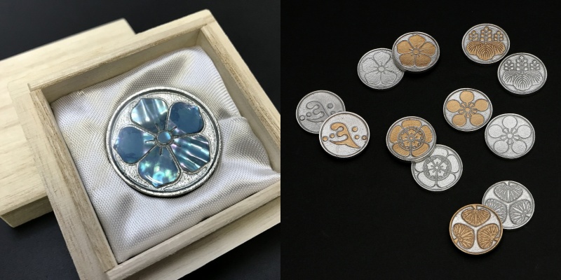 ●カラー/金・銀・水色(明智のみ) ●素材/錫鋳物 ●サイズ:直径約32㎜、桐箱入り