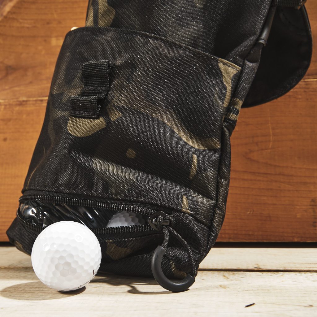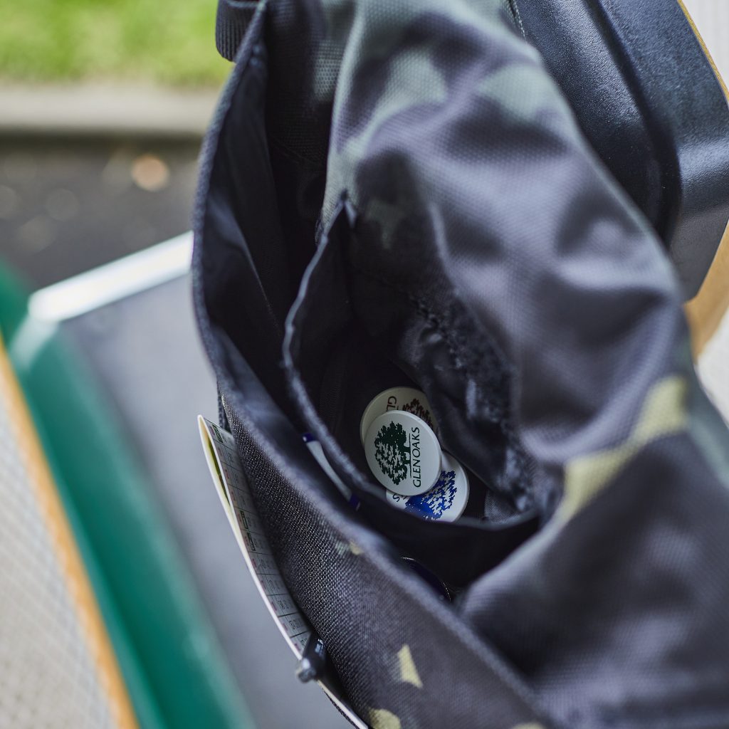 使い勝手のいいポケットと仕切り 手前はティーとスコアカード、内側にはベルクロ付きの小ポケットもあり