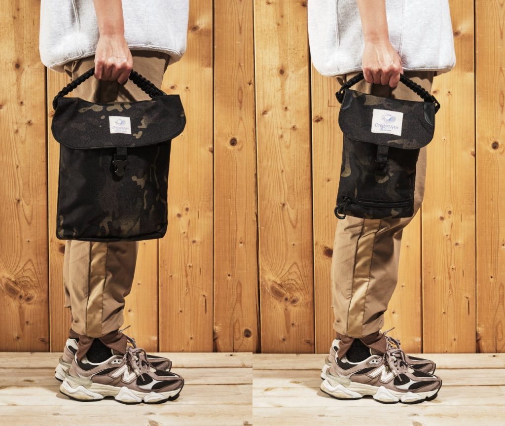 写真右が通常サイズ、写真左がラージサイズ。 どちらもアウトドアギアのようなデザインで普段使いもできる
