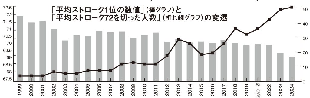 この25年間、特にここ数年で日本ツアー全体のスキルやレベルがアップしていることは、ツアーのスタッツの「平均ストローク」の推移、また72を切った選手の人数を見ればわかります。初めて70を切ったのが19年の申ジエさん。日本人では22年に山下美夢有さんが70を切って以後、3年連続69台で1位。昨年は2位の竹田麗央さん、3位の岩井明愛さんまでが69台。このトップ3の選手は今季から米ツアーに参戦しています。