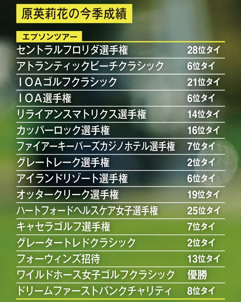 原は、米女子下部ツアーであるエプソンツアー16試合に参戦し、ここまで予選落ちゼロ。現在ポイントランキング4位で、参戦前に最低限の目標としていた10位までに与えられる来年のLPGAツアーの出場権を確定させている(※データは9月4日時点のもの)