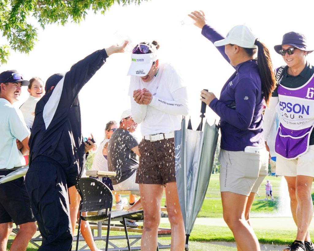 エプソンツアーで初優勝を決め、同時に来年のLPGAツアーの出場権も確定させた原に、エプソンツアーをともに戦う伊藤二花がウォーターシャワーで祝福する