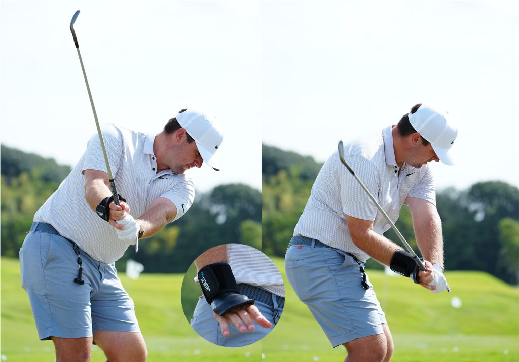 現在、飛距離8位(316Y)のC・ゴッタラップが右手に練習器具を付けている姿を見て、「手首が折れすぎないように、右手首の角度をチェックしながら練習しているんでしょうね。コリンが『なんのためか』と聞いたら、『クセでクロスに入る。コンパクトな位置で止まるようにしたい』と答えています。あとは、左手のグローブのテープを止めないのは“手嶋多一派”ですね。窮屈なんでしょう。フィーリングの問題ですね」