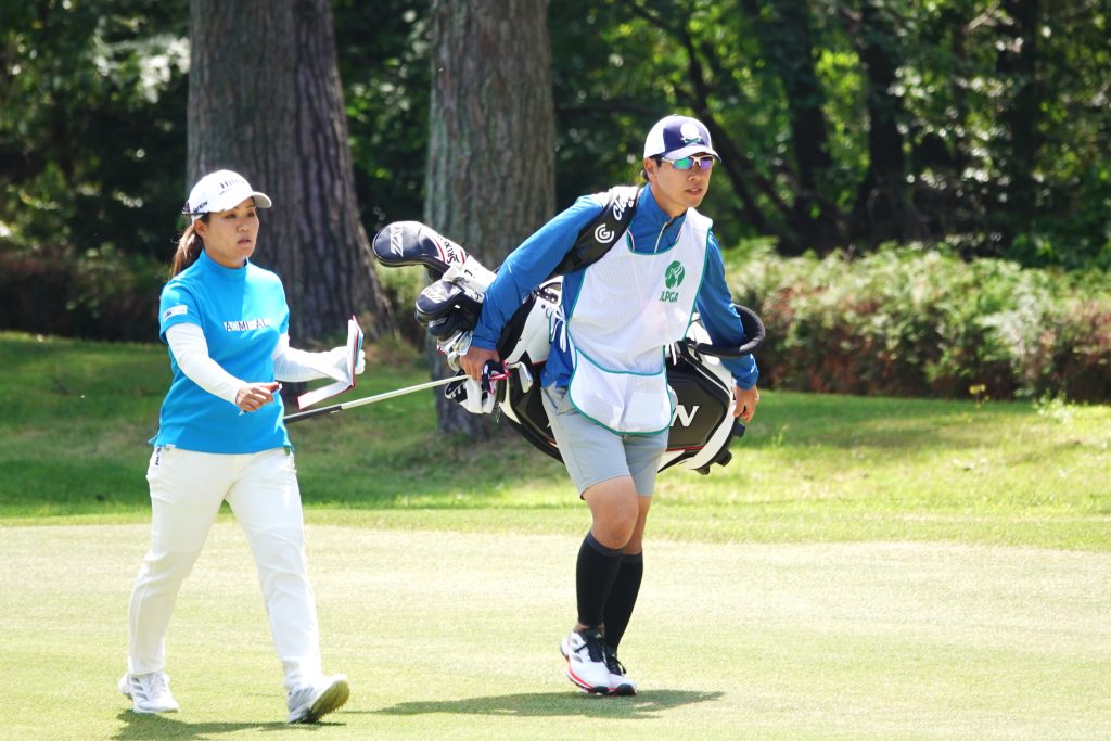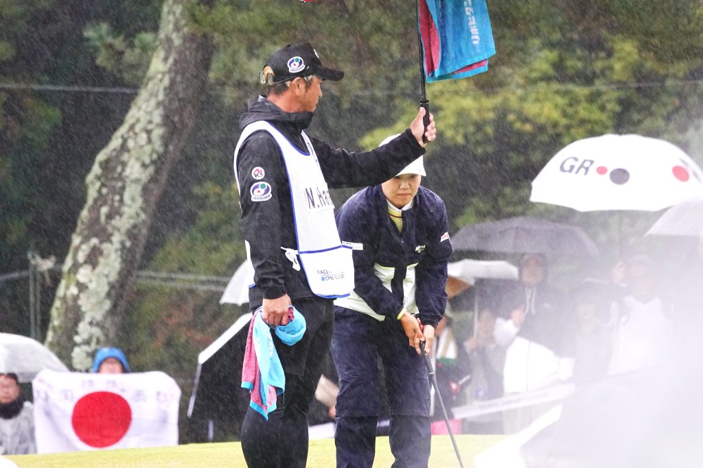 大雨の中、献身的なサポートでキャディの重役を果たした木名瀬さん。「ちょっと弱かった」と畑岡が感じた2メートルのパーパットは、チームNASAの思いが乗ったかのようにカップに吸い込まれた