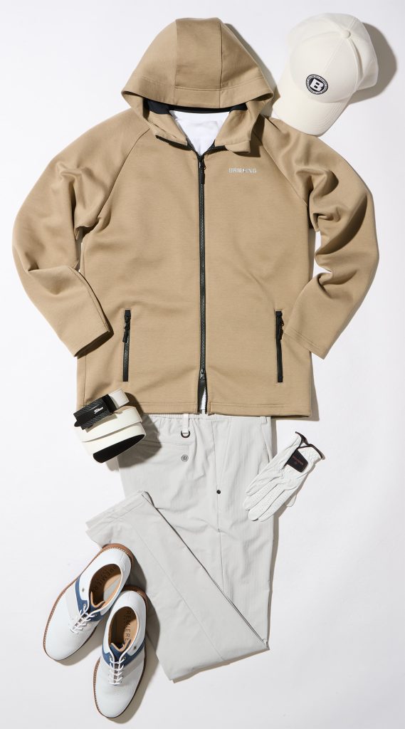 モチッとした手触りのスウェット素材と、キャメルの色味で暖かな印象を演出。フーディ3万7400円、ハイネック2万900円、パンツ3万4100円、キャップ8250円、グローブ5500円/すべてBRIEFING GOLF、ベルト8250円/タイトリスト、シューズ4万4000円/フットジョイ