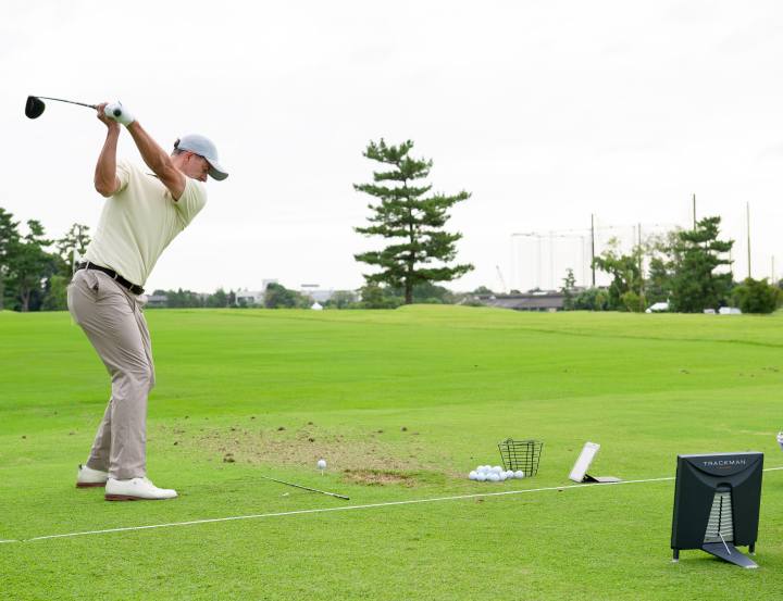 ジャパンゴルフスクール(千葉)のドライビングレンジで行われたセミナーのオープニングは、アダムのお手本ショットから。