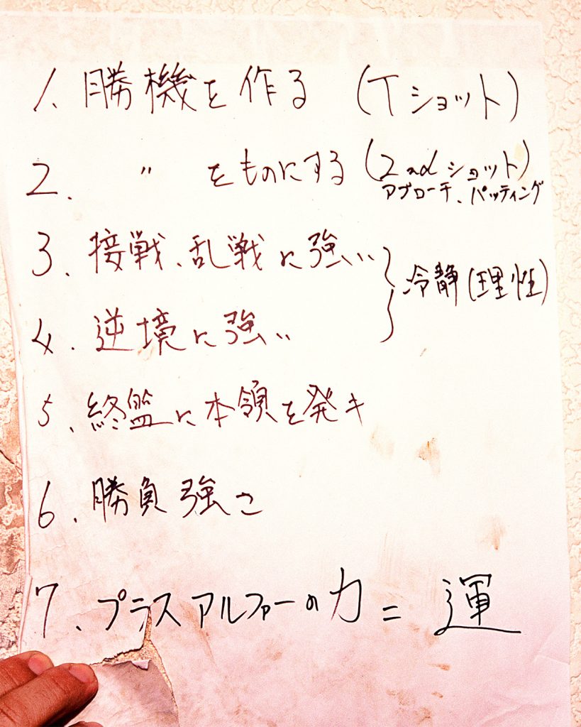 壁に張られた紙には①勝機を作る(Tショット)、②勝機をものにする(2ndショット、アプローチ、パッティング)、③接戦、乱戦に強い、④逆境に強い/冷静(理性)、⑤終盤に本領を発揮、⑥勝負強さ、⑦プラスアルファの力=運、と書いてあった。ジャンボの強さそのものだといえよう