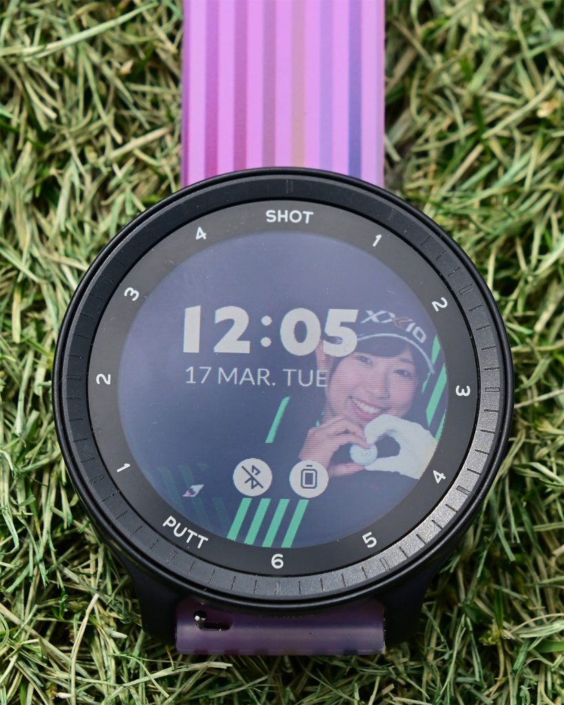 「電源を入れると私の顔が出てくるようになっているんです(笑)。バンドもパステルピンクをベースにナナイロレインボーデザインにしてもらいました。ぜひ試合会場や普段のゴルフ、そして時計として普段使いもしてもらいたいです」(菅沼)