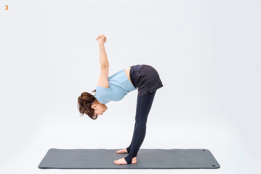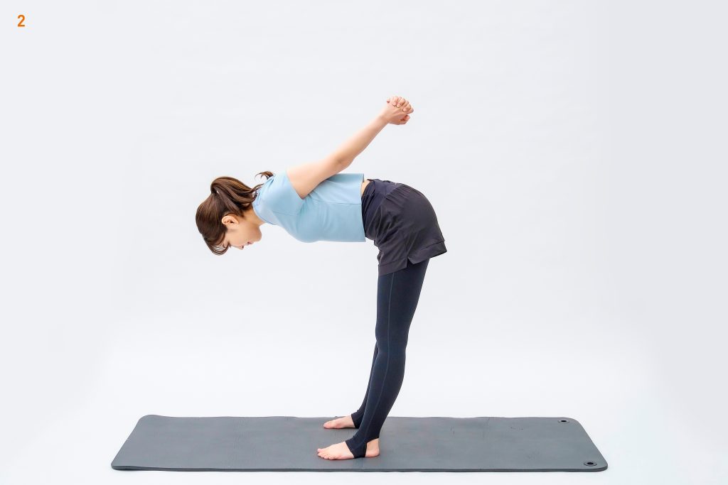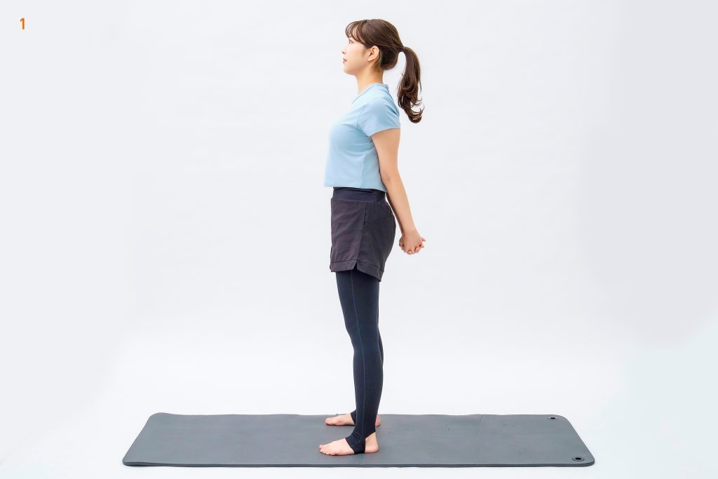 足を肩幅に開き、両手を背面で組んだ姿勢でスタート。そこから上体をゆっくりと前屈させます。背面で持ち上げた両手が垂直になるのが理想ですが、無理ならひざが曲がらない範囲で目いっぱい前屈します。1呼吸(2~3秒)で前屈し、2呼吸キープし、1呼吸で元に戻ります。それを3回繰り返します。(4呼吸×3回)