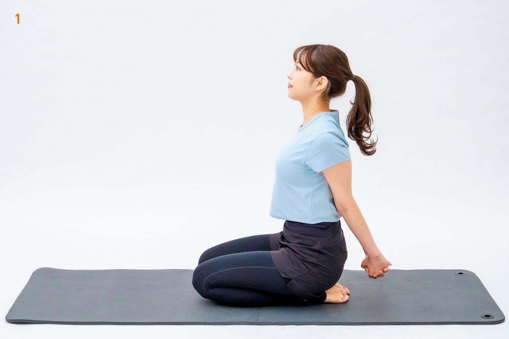 このポーズは立った姿勢で行うと、下半身にも適度な刺激が入り、座った姿勢で行うと立位よりも背面に強い刺激が入ります。