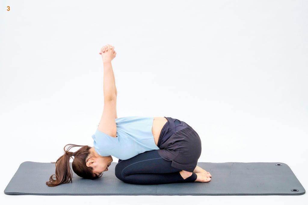 ポーズ1と同じ動きを正座で行います。お尻をかかとにつけたまま、おでこがマットにつくのが理想ですが、無理ならおでことマットの間に枕を置いてもOKです。頭を固定することで胸郭や肩関節への刺激が高まります。こちらも1呼吸で前屈し、2呼吸キープし、1呼吸で元に戻ります。(4呼吸×3回)