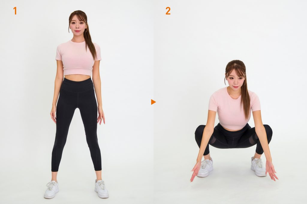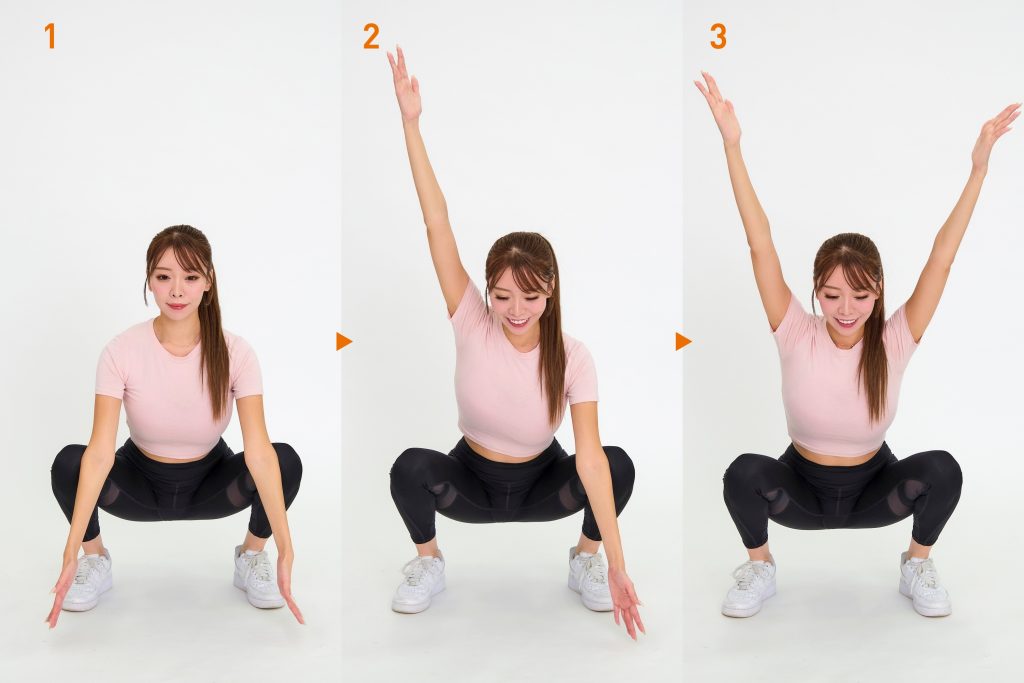 足を肩幅に開いた姿勢でスタート。そこから床に手をつけるようにしゃがみます。胸を張ってしゃがむのが大事なポイント。ひじをひざの内側に引っかけ、押し合うように胸を張ります。1呼吸(2~3秒)でしゃがみ、1呼吸キープし、1呼吸で元に戻ります。それを3回繰り返します。(3呼吸×3回)