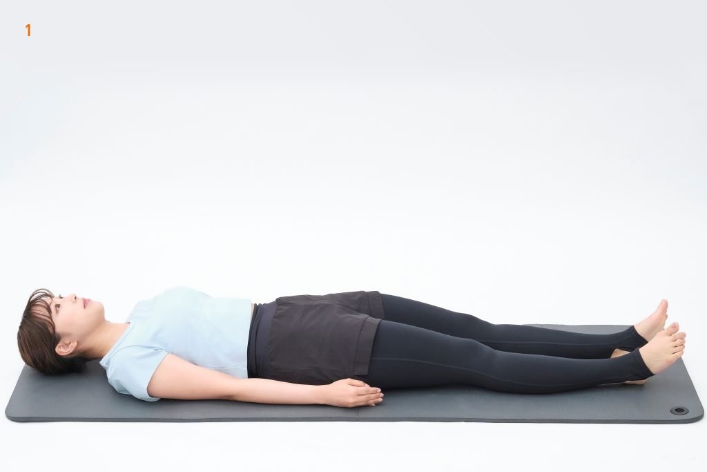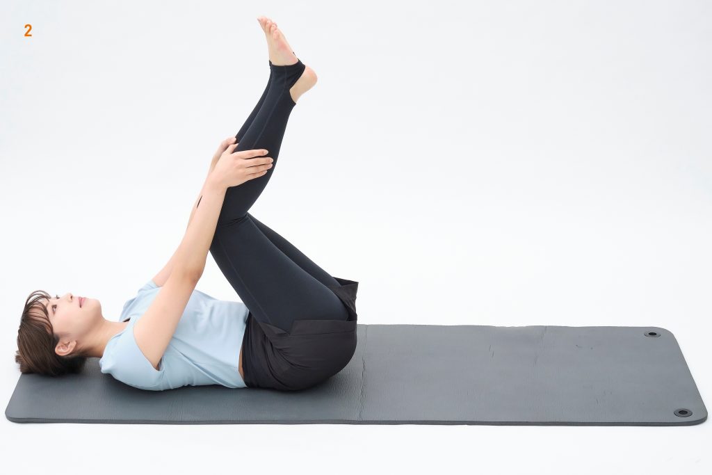 仰向けに寝た姿勢でスタート。そこから両脚を持ち上げ、すねを持ちます。ポーズ1から2へ移行できますが、このポーズだけでもOK。すねを手でサポートしつつ、太もも裏を伸ばします。1呼吸(2~3秒)で持ち上げ、2呼吸キープし、1呼吸で元に戻します。それを3回繰り返します。(4呼吸×3回)