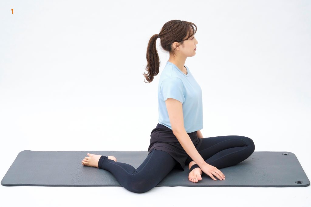 ヨガの「ハトのポーズ」は前後脚で座り、伸ばした脚を持ち上げ後ろ側のひじにかける難度の高いポーズですが、この半分ハトのポーズは難度が低いです。両脚を前後に開き、前脚を曲げ、上半身を前に倒して体重をかけます。そうすると前脚側のお尻がしっかり伸ばせます。