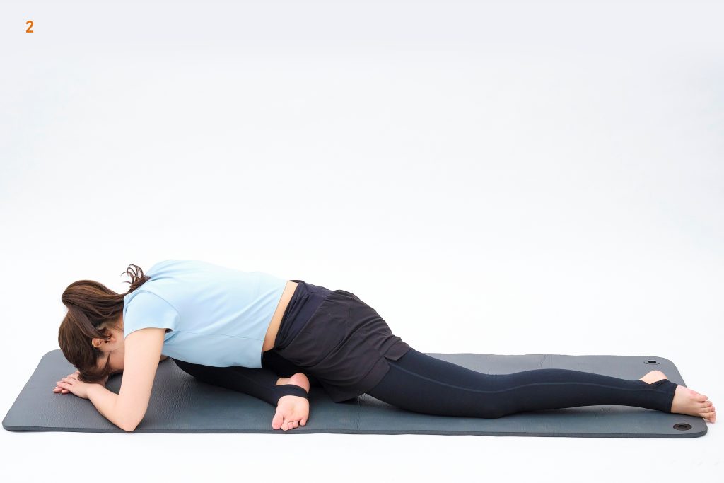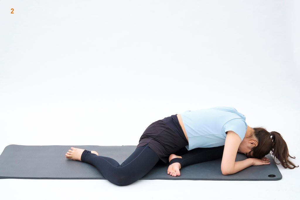 左脚を曲げて前に出し、右脚を曲げて後ろに出した姿勢でスタート。そこから両手とおでこをマットに付けるように体を前に倒します。後ろ脚を真っすぐ伸ばすのが理想ですが、キツい人は曲げたままでOK。2~3呼吸(約10秒)キープしたら、脚の前後を入れ替え、同様に2~3呼吸キープ。(2~3呼吸×1回)