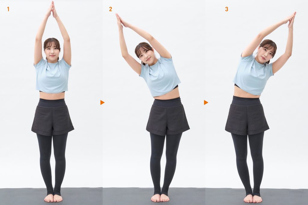 両脚を閉じ、両手を上げ、手のひらを合わせた姿勢でスタート。そこから上半身を真横に倒します。1呼吸(2~3秒)で倒し、1呼吸キープし、1呼吸で元に戻します。逆サイドも同様です。上体が前に倒れやすいので、角度は浅くても真横に倒すのがポイント。左右5回ずつ繰り返します。(3呼吸×左右5回)